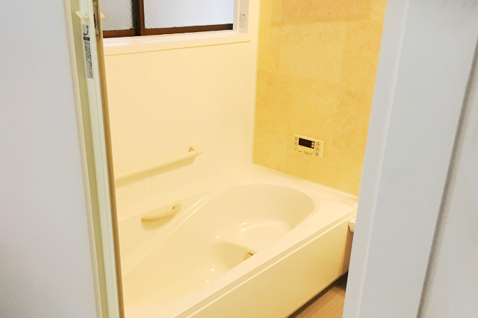 お風呂場。腰掛タイプの浴槽や、浴槽横の手すりなど、二世帯住宅にも嬉しい細かい気遣いがあります。